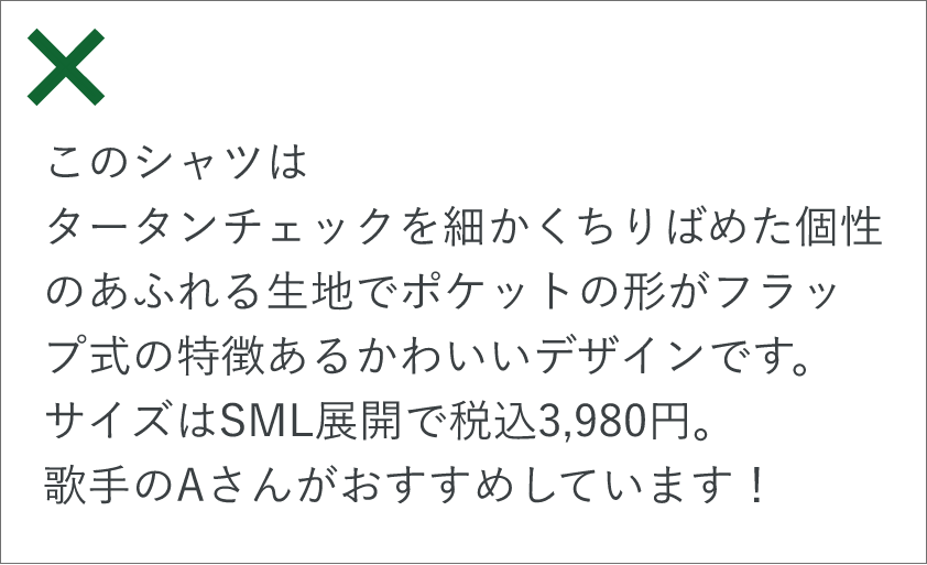 例えば商品を説明する欄があるとします。言葉で「このシャツはタータンチェックを細かくちりばめた個性のあふれる生地でポケットの形がフラップ式の特徴あるかわいいデザインです。サイズはSML展開で税込3,980円。歌手の●●さんがおすすめしています。」と説明があって売れるでしょうか。有名人が進めている、という文言は強いところも感じられますが。ここにその商品の画像を載せるのとないのとでは大きく売れ行きに関わってくると思います。言葉やイラストなどで説明するよりも実物の画像を見せることがイメージとして一番有効という法則です。