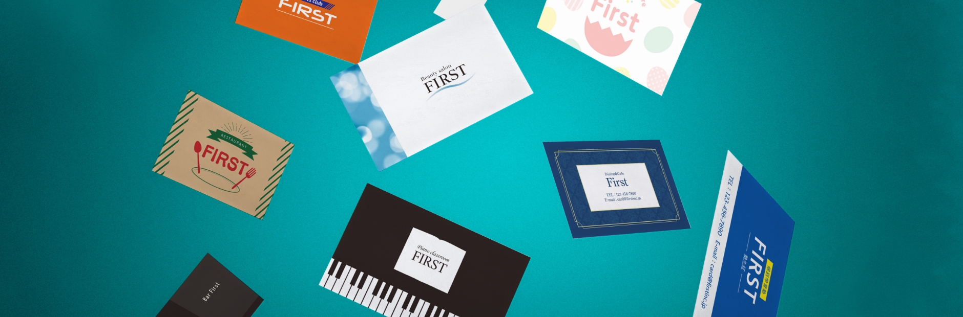 横に小さくカタカナ2段でショップカード、ファーストと並べて間にラインをあしらうとただ単にショップカードFIRSTと記載するよりはるかにおしゃれでロゴっぽくなります。文字の並べ方に意味を持たせたらそれでデザインパーツになり得ます。