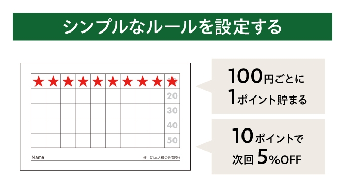 お客様が「どのくらいお得になるのか」を明確に理解できるように、シンプルなルールを設定しましょう。複雑なルールはお客様に伝わりにくく、逆に利用率が下がる原因になります。