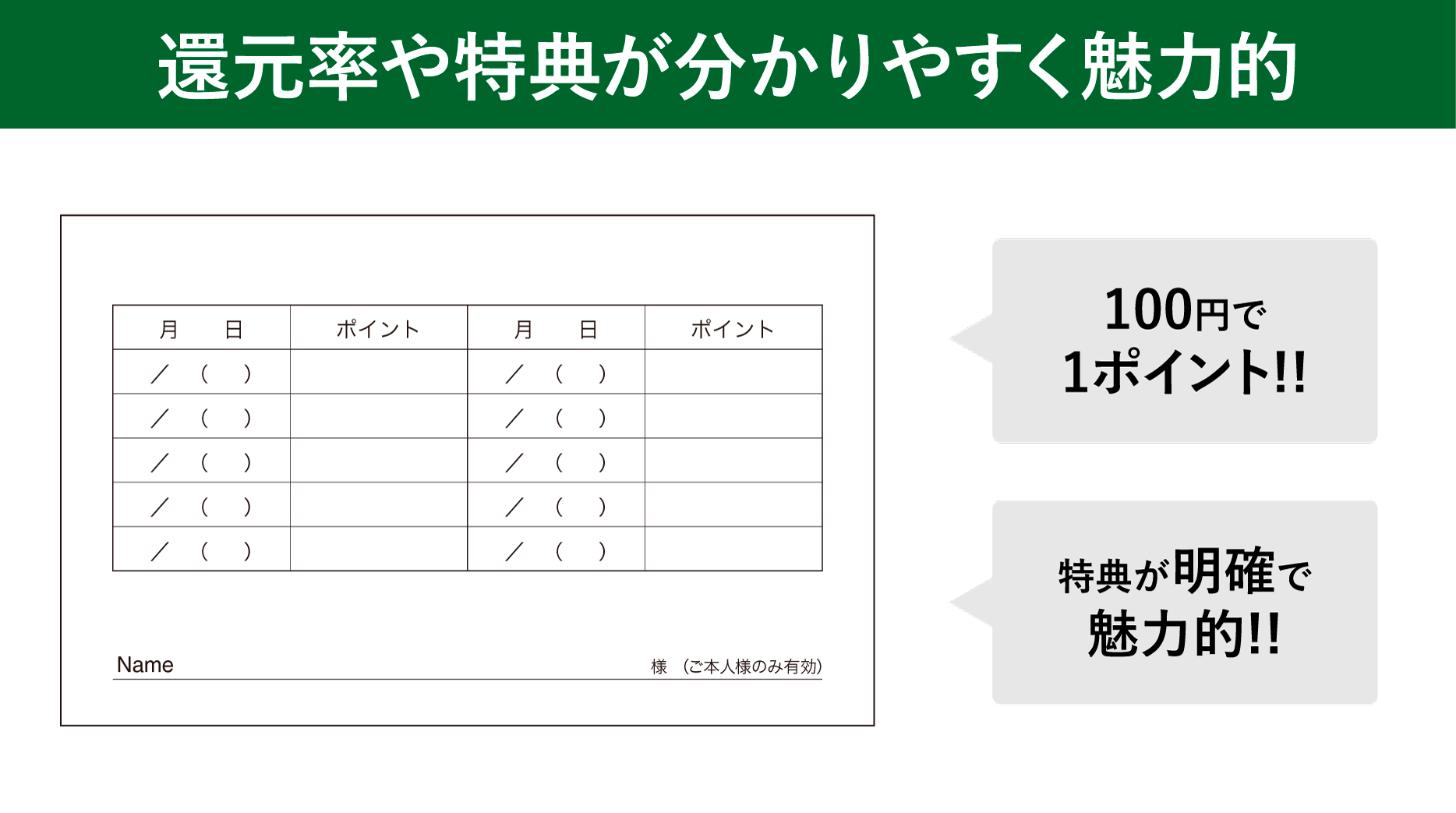 「100円で1ポイント」など、計算しやすく覚えやすいルールが顧客には好まれます。さらに、特典内容が明確かつ魅力的であれば、「また来よう」という行動を引き出せます。
