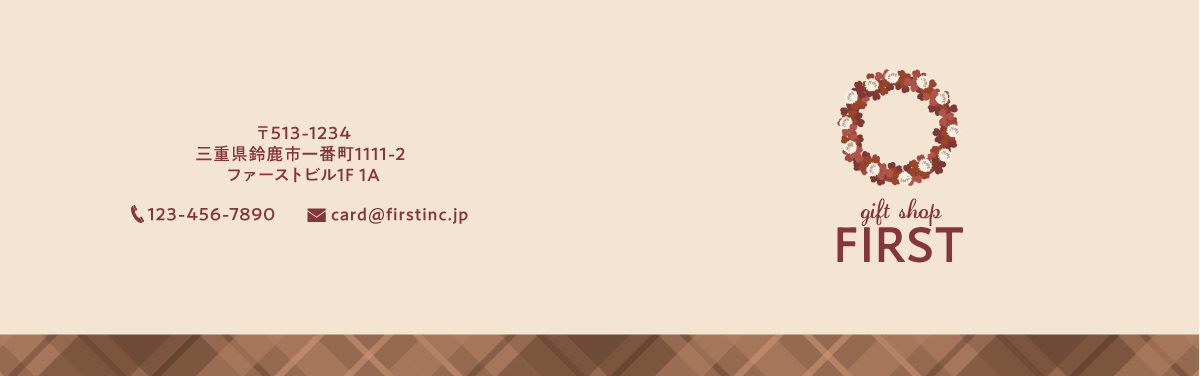 シックなカラーリングのチェックとリースをあしらったデザイン。贈答などを取り扱う店舗をイメージして、ギフトショップで配られるスタンプカードとなっております。落ち着いた色合いは他のショップカードにも展開が可能!