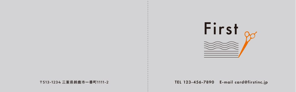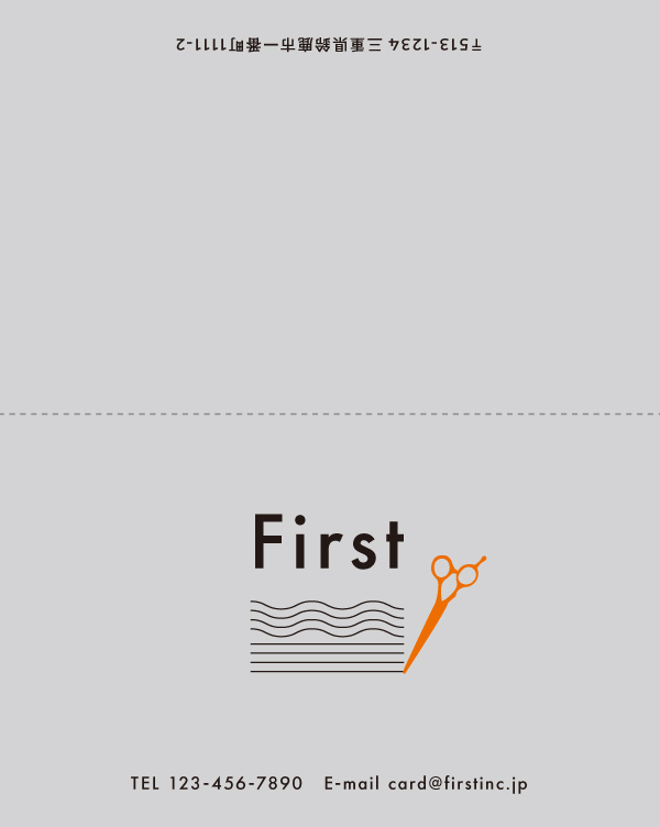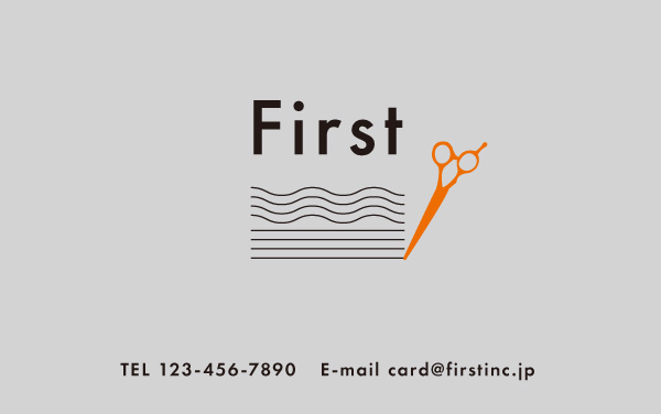 線を髪に見立て、カットしている様子が描かれたショップカード。 シンプルなトーンでまとめて、差し色としてオレンジをプラス。 【オススメ業種】 美容院・サロン・雑貨屋など 【オススメ用紙】 ナチュラル、ヴァンヌーボナチュラル、ヴァンヌーボホワイト、スフールホワイトなど